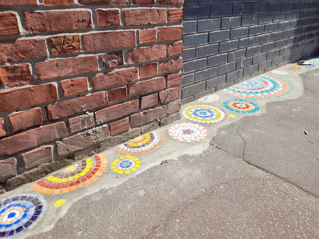 Le 2nd volet consistait , cette fois-ci, à parer le trottoir de l’école avec des mosaïques multicolores pour apporter de la gaieté et transformer ainsi un simple trottoir en “lieu remarquable”.